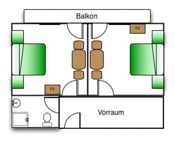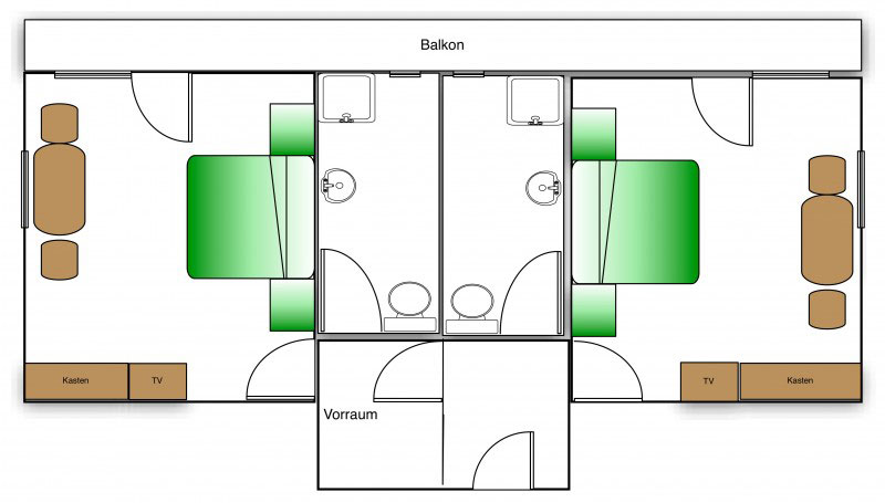 Jedes Zimmer verfügt über folgende Ausstattungsmerkmale: